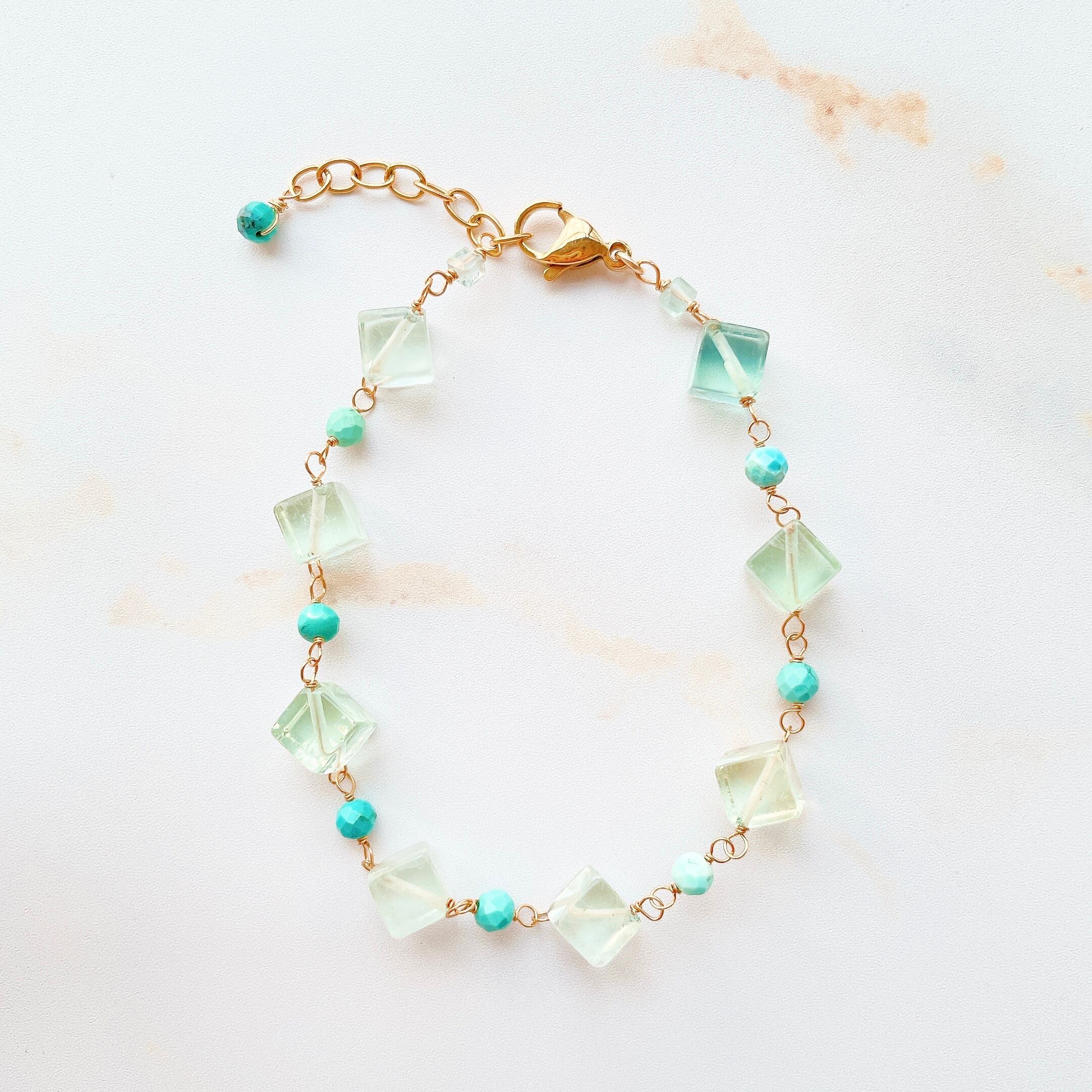 キューブ型の澄んだグリーンフローライトを、並べて丁寧に繋いだブレスレット。