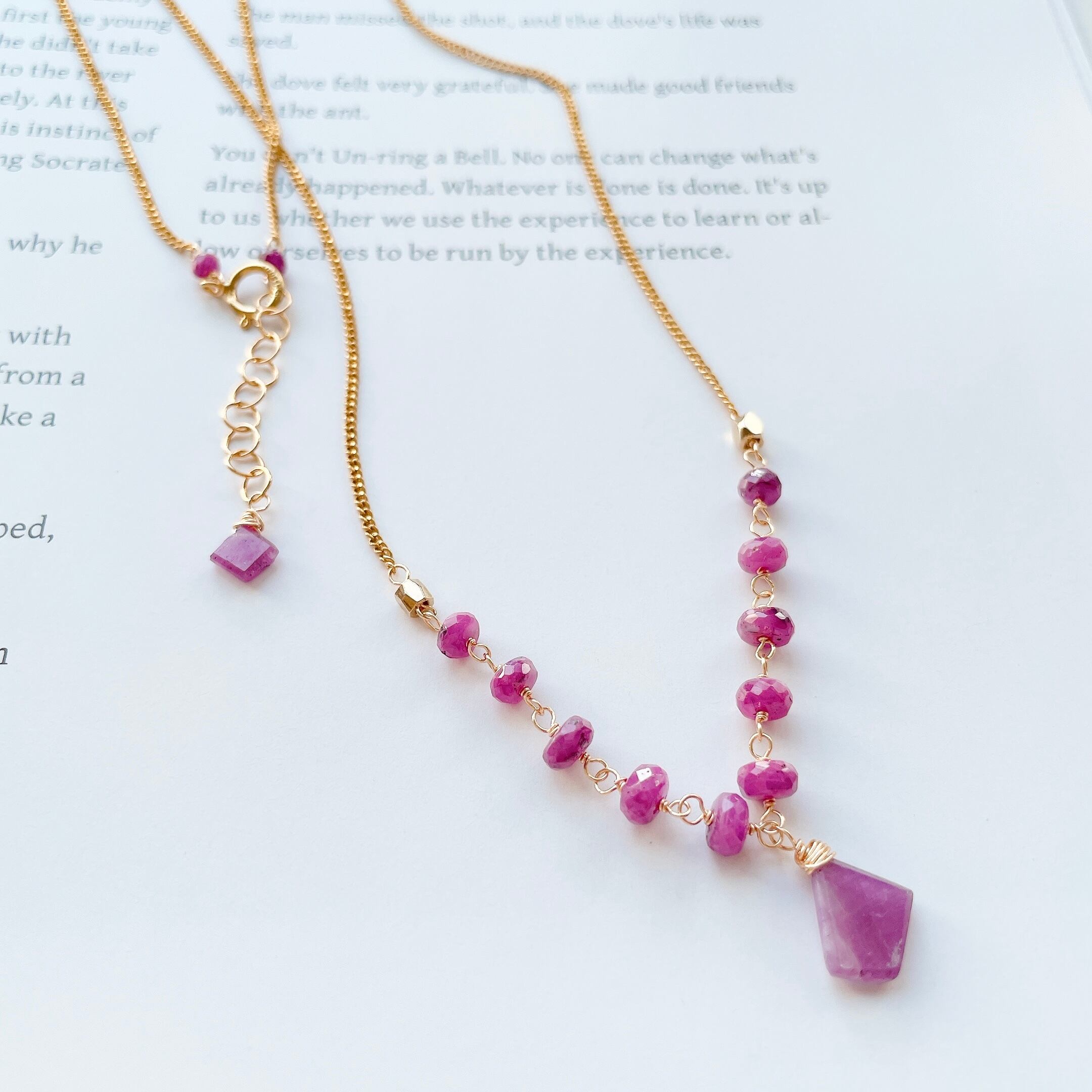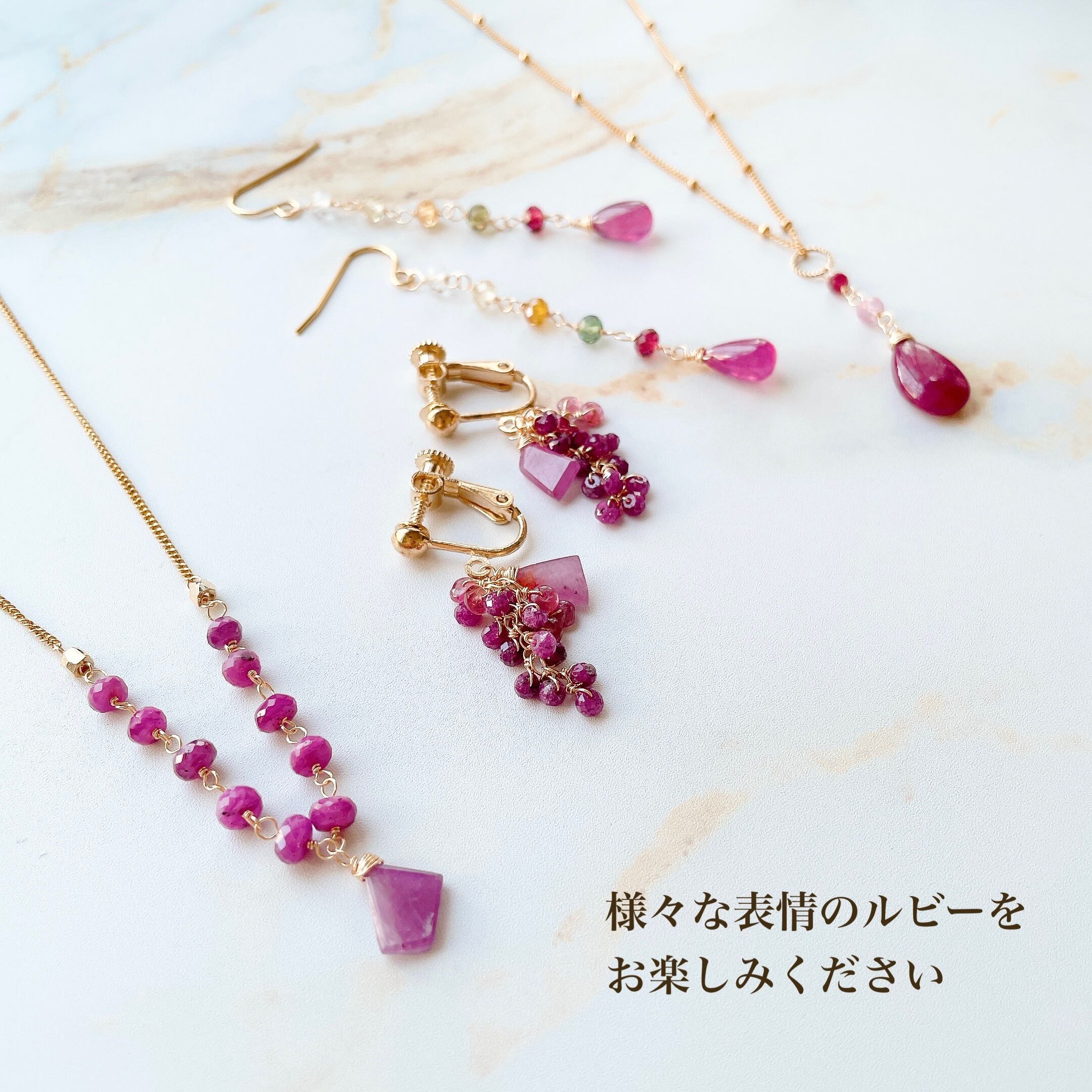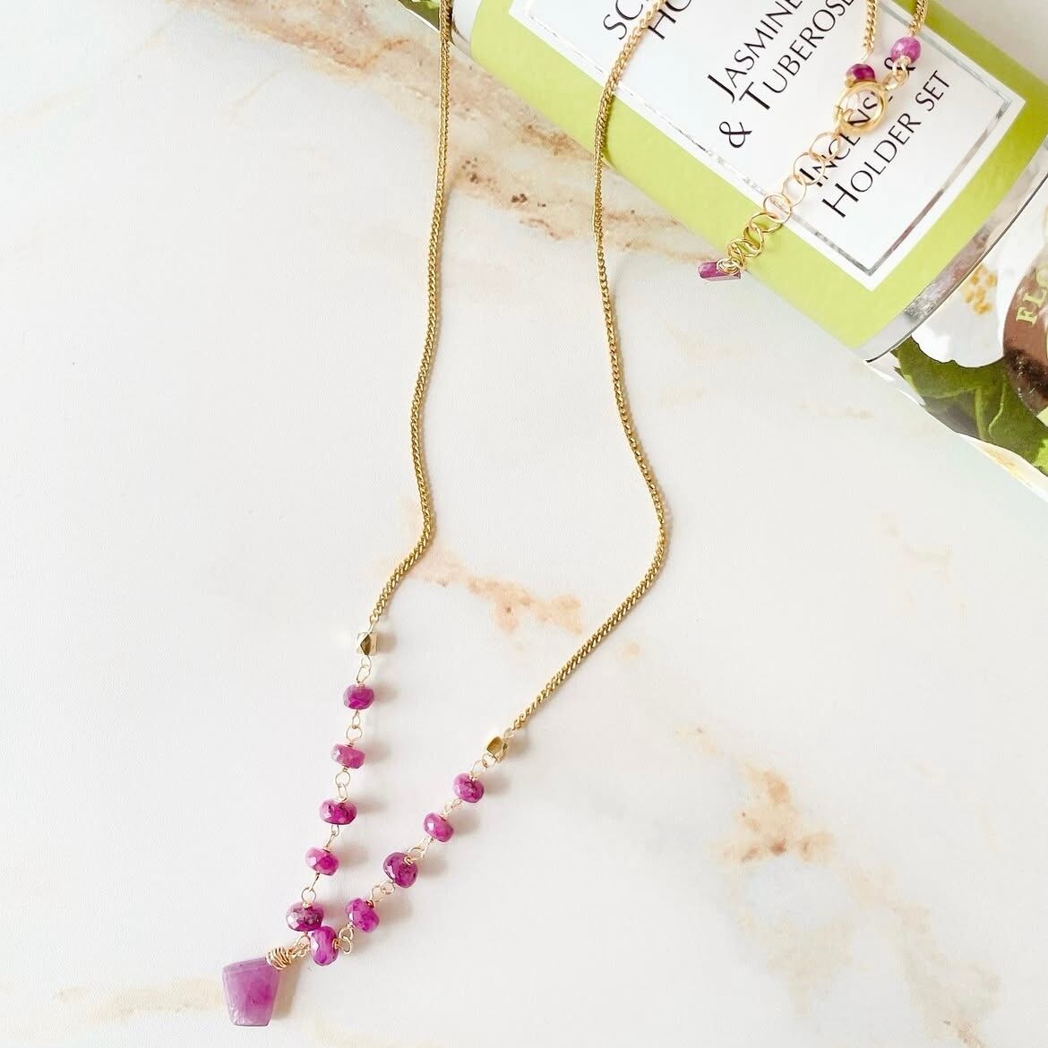 14金ゴールドフィルドのシンプルなチェーンに、天然のルビーを繋ぎました。