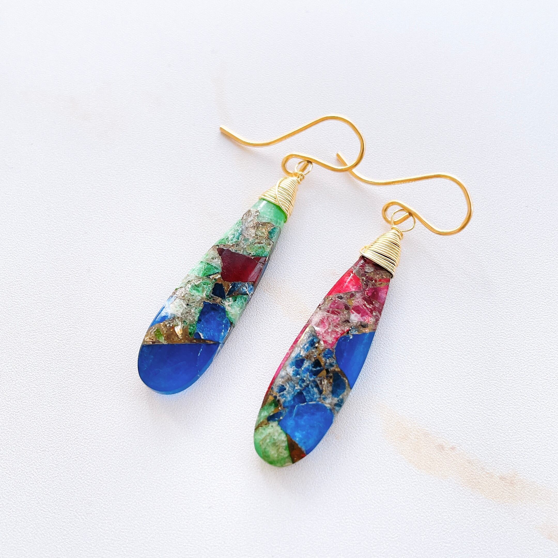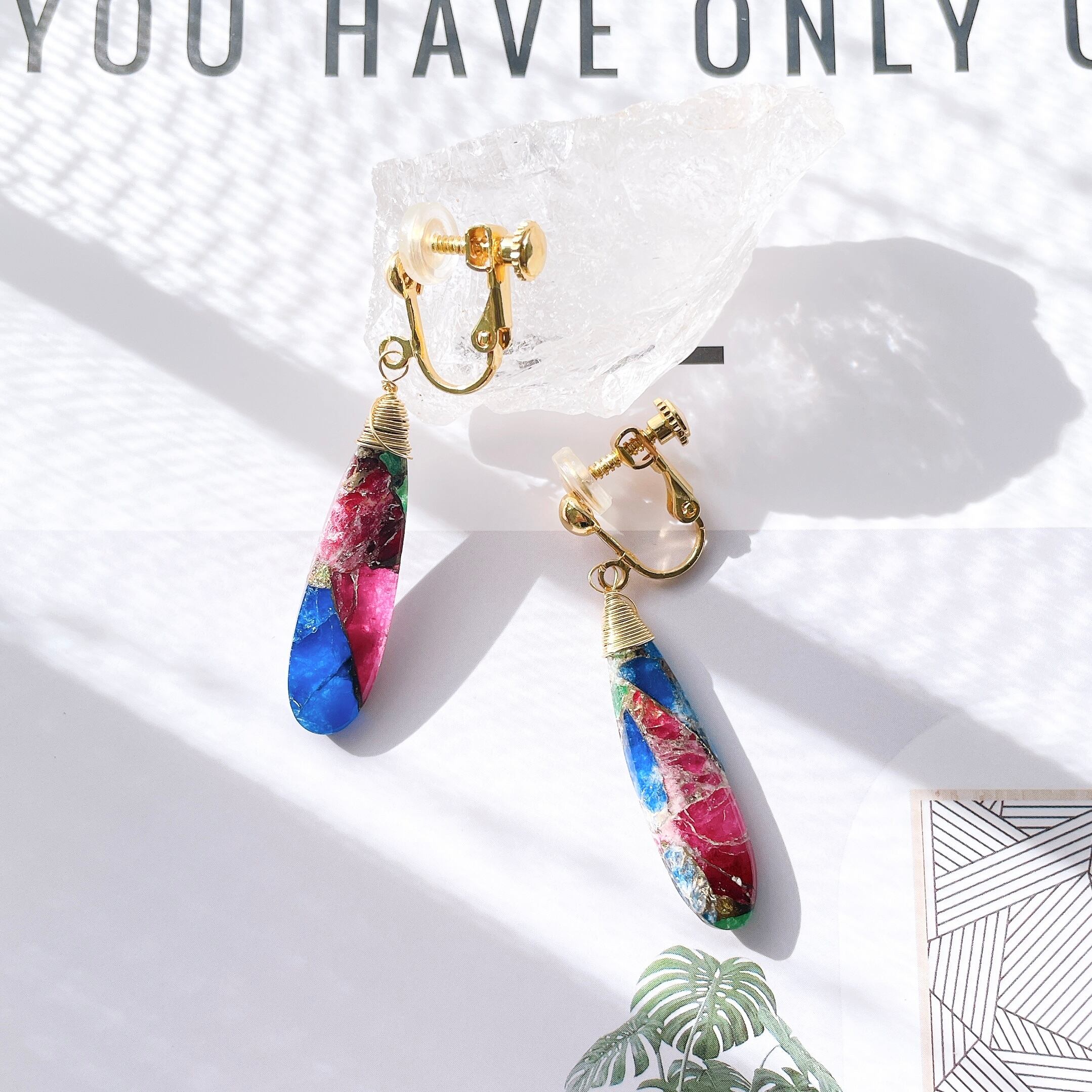 ブルーやピンクのカルセドニーなどを細かく砕き、コッパーと合わせて仕立てたカラフルなコンポジットストーン。