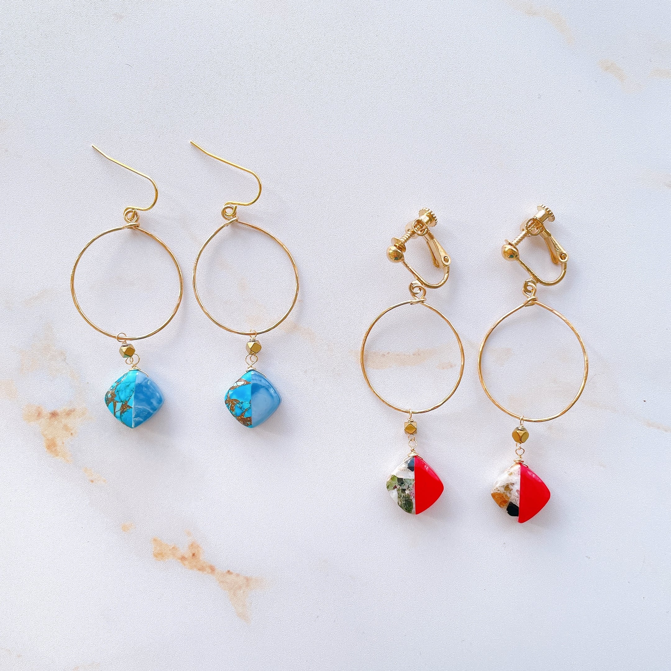 手作りの丸いフープに、ダイヤ型のコッパーストーンをあしらった個性派ピアス。