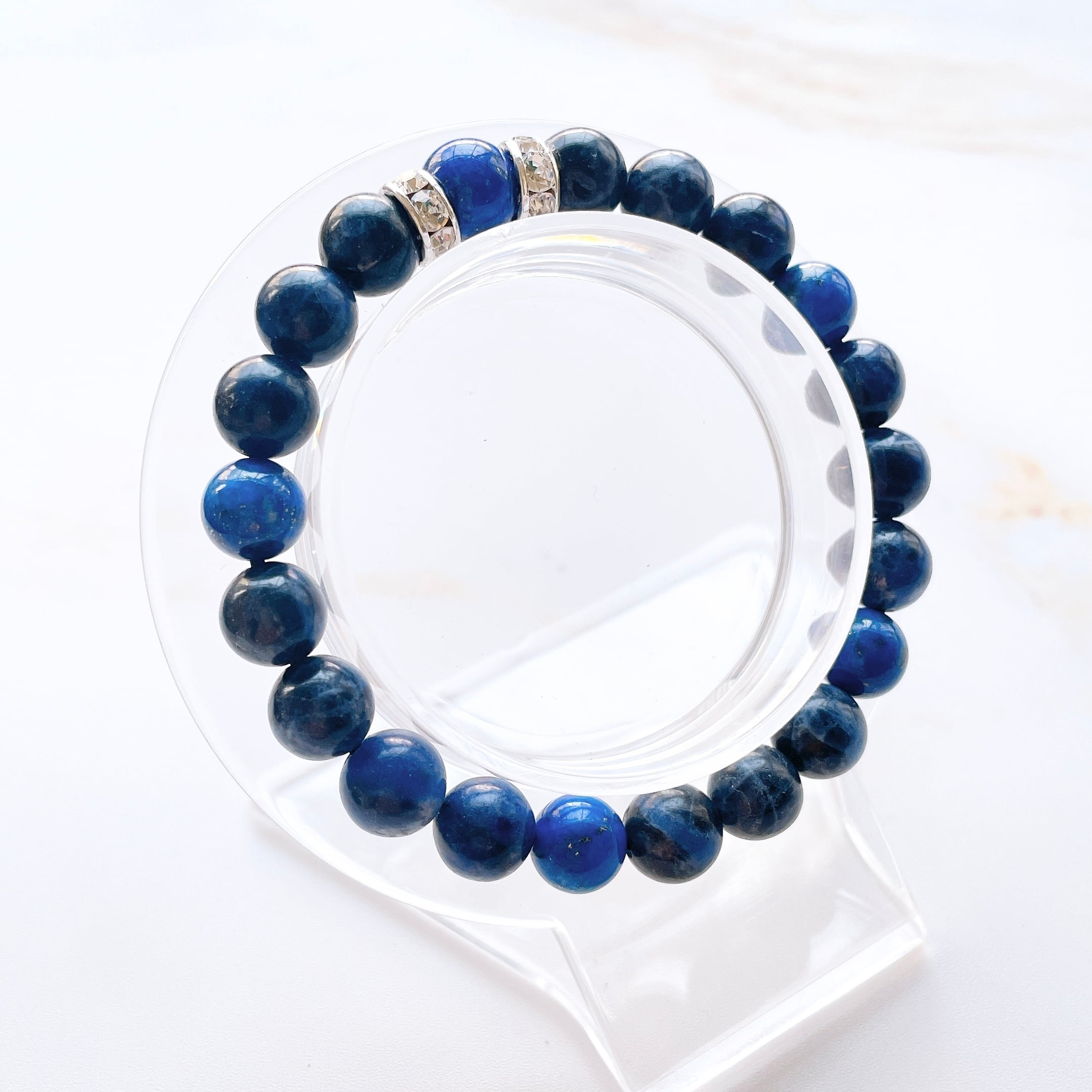 深みのあるブルーが印象的なソーダライトに、静かな輝きを宿すラピスラズリを添えた、知性と気品を纏うパワーストーンブレスレット。